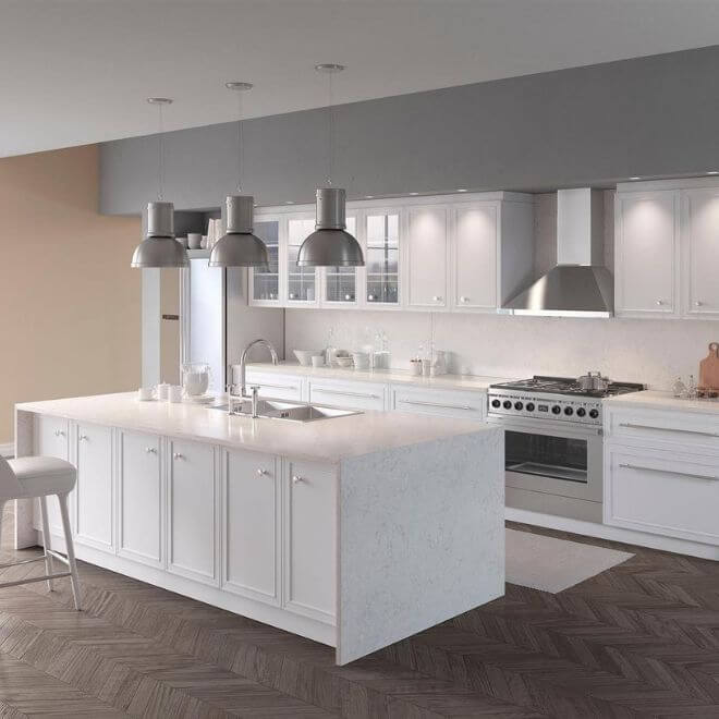 Fusion White features a simple white background with light grey splashes, resembling random paintbrush flicks. The irregular pattern complements solid-coloured cabinetry, adding sophistication and a touch of old-world glamour. Versatile enough for traditional or contemporary settings, Fusion White effortlessly enhances various kitchen styles.