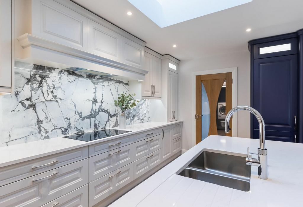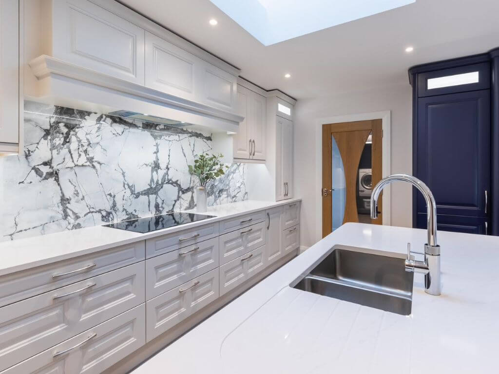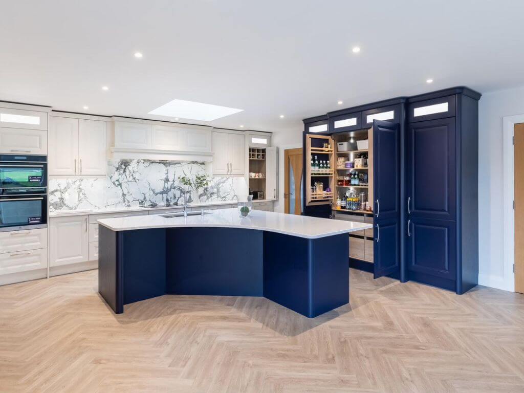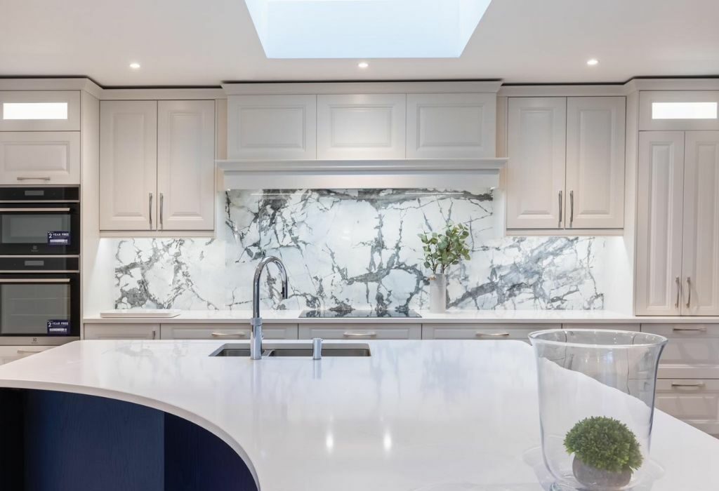 This beautiful renovation project in the heart of County Mayo features a striking curved island crafted in Statuario marble, complemented by a Cote D’Azure porcelain backsplash, both provided and installed by our team.